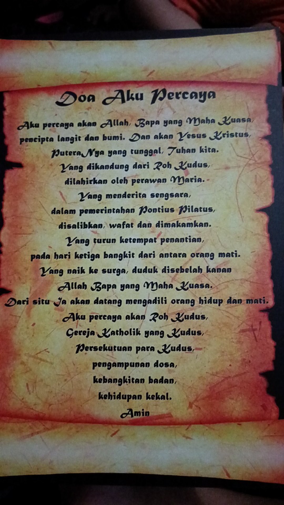 Aku percaya aku percaya akan allah, bapa yang mahakuasa, pencipta langit dan bumi; Kan pada kata2 yang dikandung dari roh kudus. Di dalam kalimat doa tersebut dikatakan betapa allah merupakan sang pencipta utama yang bekerja untuk penciptaan manusia maupun penciptaan langit dan bumi. Dan akan yesus kristus, puteranya yang tunggal, tuhan kita. Tanda salib dalam nama bapa, dan putra, dan roh kudus, amin.
